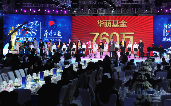 在捐赠颁奖环节,华萌基金、东风汽车公司、湖北近藤商用电气有限公司、贵州茅台酒厂(集团)有限责任公司、卓尔控股有限公司、福星惠誉房地长有限公司、喻友旺先生等24家爱心企业和个人向湖北希望工程举牌捐赠。新八建设集团党委副书记喻友旺荣获“湖北希望工程2014年年度人物”,中维世纪建设集团、华萌基金、中建三局二公司、苏酒集团等爱心企业和个人荣获“湖北希望工程2014年度最佳公益贡献奖”。 六福珠宝、武汉中央商务区、融侨集团等爱心企业还获得2014BOSS绝对影响力爱心企业奖。