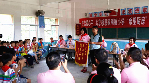 6月13日,“牵起爱心的手 共享感恩的家——希望厨房揭牌仪式”在阳新县排市镇明德小学举行。捐方武大总裁53班同学代表和省青基会秘书长张奕、武汉大学经管学院EDP管理中心主任张群、黄石团市委书记禹爱民等参加活动。